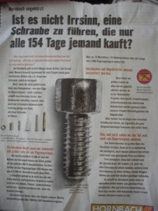 Leider wird eine Marke auch im 21. Jahrhundert nur durch ganz spießige Leistung zur Marke, das langweilige Thema kam in den Spots jedoch nie zur Sprache. Stattdessen wird das immerhin für die Zahlung verantwortliche Publikum mit Unsinn vollgedröhnt (Yippiejahjahjej!) und zwar lange bevor es irgendeinen Baumarkt betreten hat. Hornbach macht nun etwas anderes, etwas das in dieser Umgebung an Innovationskraft nicht zu übertreffen ist: Es werden dezidiert die Leistungen der großen Baumarktkette aufgezählt, die EIGENEN Leistungen. Sie werden auch noch interessant erzählt und erklärt: “Bei Hornbach arbeiten 292.534 Jahre Erfahrung. Wofür eigentlich?” Scheinbar “dröge” Fakten werden aufgezählt, Fakten die Kompetenz (be-)greifbar machen, z.B. 13.000 geschulte erfahrene Mitarbeiter, 120.000 Artikel, 13% Fachkunden, durchschnittlich 11.300qm-Fläche, über 500km Regale, etc. Das alles eingebettet in Text, obwohl es häufig in Vorgesprächen heißt: Niemals zu viel oder überhaupt Text in eine Anzeige “packen” – ist anachronistisch und liest sowieso niemand. Ungeachtet dessen erzählt die Marke, warum sie zahlreiche seltene Artikel für ihre Kundschaft vorrätig hält: “Ist es nicht Irsinn eine Schraube zu führen, die nur alle 154 Tage jemand kauft?” Eine tolle Kampagne, die zeigt, dass Leistung niemals langweilig sein muss und jede Marke eine besondere Geschichte zu erzählen hat – wenn man sie nur lässt.